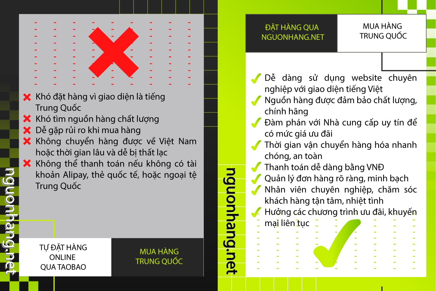 | Được hỗ trợ hầu hết các dịch vụ tìm kiếm nhà cung cấp cũng như nguồn hàng chất lượng, thanh toán mua hàng, đổi trả hoặc xử lý những vấn đề phát sinh. | Thanh toán một phần tiền hàng trước khi mua hàng. |